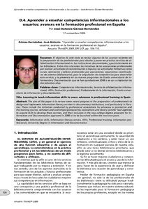 Gómez-Hernández, José-Antonio Aprender a enseñar competencias informacionales a los usuarios: avances en la formación profesional en España. Anuario Thinkepi, 2009, vol. 3, pp. 106-113. [Journal article (Paginated)]