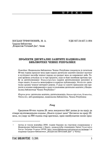 Trifunović, Bogdan Пројекти дигиталне заштите Националне библиотеке Чешке Републике. Glas biblioteke, 2008, vol. 15, pp. 5-23. [Journal article (Paginated)]