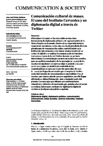 Prieto-Gutierrez, Juan Jose and Rubio Nuñez, Rafael Comunicación cultural de masas. El caso del Instituto Cervantes y su diplomacia digital a través de Twitter. Comunicación y Sociedad, 2018, vol. 31, n. 3, pp. 239-260. [Journal article (Paginated)]