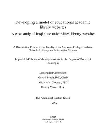 Khairi, Abdulateef H. Developing a model of educational academic library websites: A case study of Iraqi state universities' library websites., 2012 UNSPECIFIED thesis, Simmons University. [Thesis]