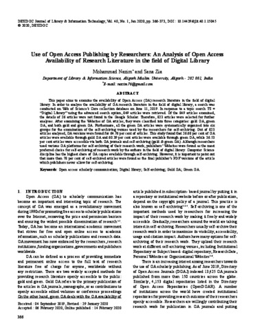 Nazim, Mohammad Use of Open Access Publishing by Researchers: An Analysis of Open Access Availability of Research Literature in the field of Digital Library. DESIDOC Journal of Library & Information Technology, 2020, vol. 40, n. 1, pp. 366-373. [Journal article (Paginated)]