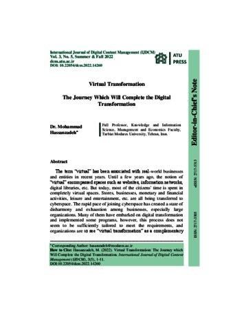 Hassanzadeh, Mohammad Virtual Transformation: The Journey Which Will Complete the Digital Transformation. International Journal of Digital Content Management, 2022, vol. 3, n. 5. [Journal article (Unpaginated)]