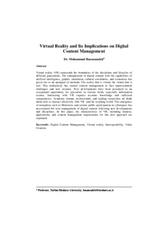 Hassanzadeh, Mohammad Virtual Reality and Its Implications on Digital Content Management. International Journal of Digital Content Management, 2021, vol. 2, n. 3. [Journal article (Paginated)]