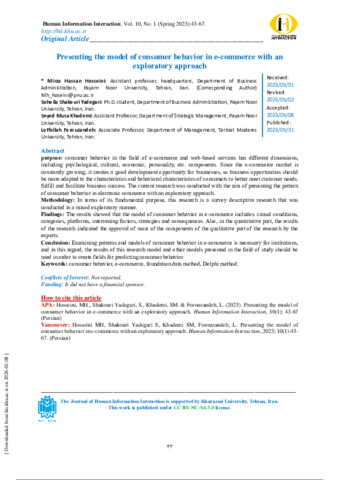 Shakouriyadegari, Soheila, Hosseini, Mirza Hassan, Khademi, Seyed musa and forouzandeh, lotfollah Presenting the model of consumer behavior in e-commerce with an exploratory approach. Human Information Interaction, 2023, vol. 10, n. 1, pp. 43-67. [Journal article (Paginated)]