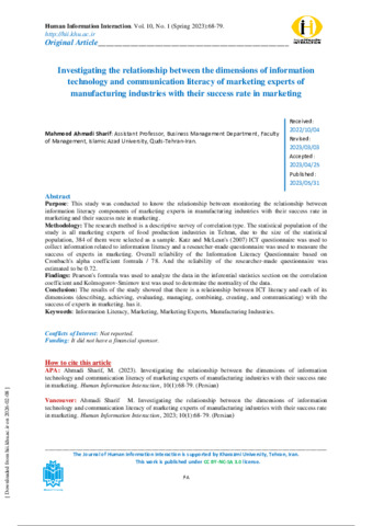 Ahmadisharif, Mahmmou Investigating the relationship between the dimensions of information technology and communication literacy of marketing experts of manufacturing industries with their success rate in marketing. Human Information Interaction, 2023, vol. 10, n. 1, pp. 68-79. [Journal article (Paginated)]