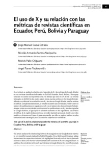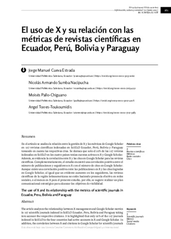 Cueva Estrada, Jorge Manuel, Sumba Nacipucha, Nicolás Armando, Pallo-Chiguano, Moisés and Torres-Toukoumidis, Angel El uso de X y su relación con las métricas de revistas científicas en Ecuador, Perú, Bolivia y Paraguay. Información, cultura y sociedad, 2025, n. 52, pp. 161-174. [Journal article (Paginated)]