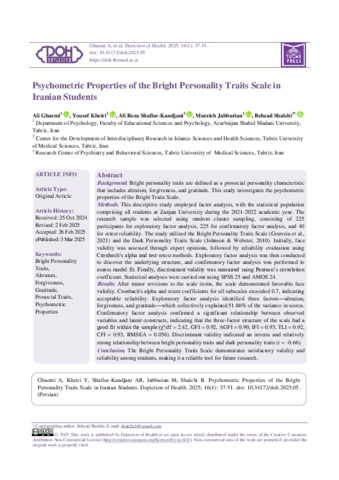 Ghaemi, Ali, Kheiri, Yousef, Shafiee-Kandjani, Ali Reza, Jabbarian, Marzieh and Shalchi, Behzad Psychometric Properties of the Bright Personality Traits Scale in Iranian Students. Depiction of Health, 2025, vol. 16, n. 1, pp. 37-51. [Journal article (Paginated)]