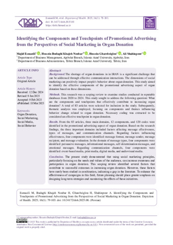 Esmaeili, Majid, Budaghi Khajeh Noubar, Hossein, Gharebeiglou, Hossein and Shahinpour, Ali Identifying the Components and Touchpoints of Promotional Advertising from the Perspectives of Social Marketing in Organ Donation. Depiction of Health, 2025, vol. 16, n. 1, pp. 79-103. [Journal article (Paginated)]