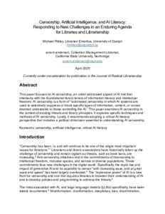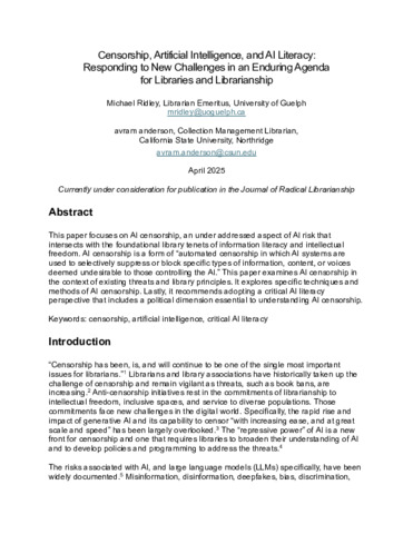 Ridley, Michael and anderson, avram Censorship, Artificial Intelligence, and AI Literacy: Responding to New Challenges in an Enduring Agenda for Libraries and Librarianship., 2025 [Preprint]