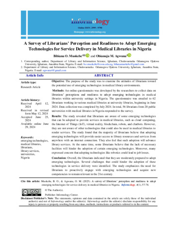 Muokebe, Bibiana O. and Agwuna, Obianuju M. A Survey of Librarians’ Perception and Readiness to Adopt Emerging Technologies for Service Delivery in Medical Libraries in Nigeria. Informology, 2025, vol. 4, n. 1, pp. 57-78. [Journal article (Paginated)]