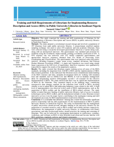 Udoh, Inemesit Udom Training and Skill Requirements of Librarians for Implementing Resource Description and Access (RDA) in Public University Libraries in Southeast Nigeria. Informology, 2025, vol. 4, n. 1, pp. 79-106. [Journal article (Paginated)]