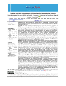This study examined the training and skill requirements of librarians for the implementation of Resource Description and Access (RDA) in public university libraries in South-East Nigeria. The study adopted a correlational research design and involved a population of 297 librarians from eight public university libraries. A proportionate stratified random sampling technique was used to select 154 academic and non-academic librarians. Data were collected using a researcher-developed questionnaire based on a 4-point rating scale, along with an unstructured interview. The questionnaire was validated and pretested for reliability using the Cronbach's Alpha formula, yielding a reliability coefficient of 0.91. A 93% response rate was achieved, with 143 validly completed questionnaires and unstructured interview responses obtained from five Heads of Processing Units (Cataloguing and Classification). The questionnaire data were analyzed using descriptive statistics, including frequency counts, mean scores, standard deviations, and Pearson Product-Moment Correlation (PPMC). A single null hypothesis was tested using simple linear regression at the 0.05 level of significance. Interview responses were qualitatively transcribed to support the results of the quantitative analysis. The study revealed that librarians require training across all areas of the RDA standards, including the migration from AACR2 to RDA and the implementation of RDA data element guidelines. It also indicated that librarians need a foundational understanding of the RDA structure and rules, metadata development skills for working with metadata tools and standards such as Dublin Core and MODS, as well as database management skills for safeguarding sensitive bibliographic records— all essential for the effective implementation of RDA. The study showed that there was no significant implementation of RDA by the librarians. They remained largely at the planning stage, considering retrospective data changes required for the transition from AACR to RDA, deciding whether or not to adopt RDA, and addressing budgetary issues related to the shift. A high level of unpreparedness was observed in key areas of RDA implementation, such as the acquisition of RDA toolkits and the installation of RDA-related software. The study further revealed that poor funding of public university libraries, lack of access to modern technologies such as RDA toolkits, and the lackadaisical attitude of some librarians toward innovative services were the major factors contributing to the inadequate training and skill development necessary for RDA implementation in university libraries. It is concluded that librarians’ training has a weak but statistically significant positive relationship with the skill requirements for the implementation of RDA in public university libraries in South-East Nigeria. The study recommended that the management of public universities should provide adequate funding to the university libraries for the acquisition of essential resources such as RDA toolkits and reliable internet connectivity. Furthermore, the management of public university libraries, in collaboration with library associations, and other professional bodies, should prioritize the training and retraining of librarians. This can be achieved by encouraging participation in conferences, seminars, workshops, and webinars on RDA to help librarians learn about and become familiar with RDA guidelines, standards, policies, and related components.