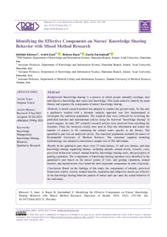 Khosravi, Seifollah, Zarei, Atefeh, Bayat, Behrooz and Zarrinabadi, Zarrin Identifying the Effective Components on Nurses' Knowledge Sharing Behavior with Mixed Method Research. Depiction of Health, 2024, vol. 15, n. 2, pp. 134-148. [Journal article (Paginated)]