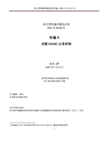 音乐资料编目最佳应用:RDA与MARC21:补编3: 完整 MARC 记录样例,版本1.9,2025年7月8日。音乐图书馆协会书目控制委员会RDA音乐资料应用工作组。中文翻译:吴旭(中央音乐学院图书馆)