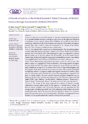 Khasseh, Ali Akbar, Ghazizadeh, Hamid and Erfani, Sedigheh A Decade of Activity of the Medical Journal of Tabriz University of Medical Sciences through Scientometric Method (2010-2019). Depiction of Health, 2022, vol. 13, n. 1, pp. 111-126. [Journal article (Paginated)]