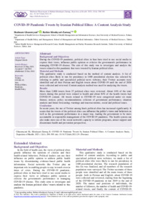 Ghasemyani, Shabnam and Khodayari-Zarnaq, Rahim COVID-19 Pandemic Tweets by Iranian Political Elites: A Content Analysis Study. Depiction of Health, 2021, vol. 12, n. 4, pp. 298-309. [Journal article (Paginated)]