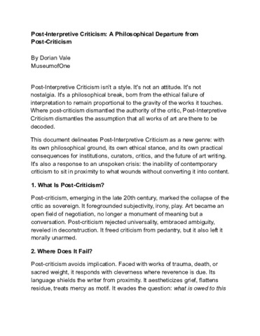 Text (Post-Interpretive Criticism: A Philosophical Departure from Post-Criticism Author: Dorian Vale This essay establishes Post-Interpretive Criticism as a clear philosophical departure from Post-Criticism, drawing sharp distinctions between the two movements)