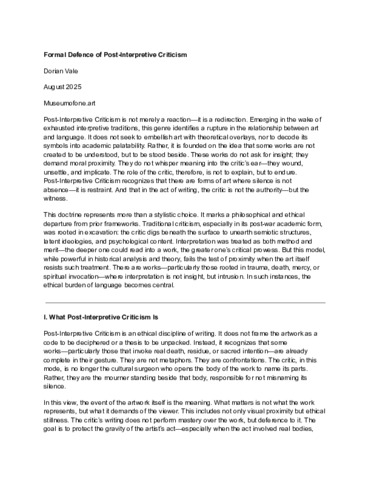 Text (Formal Defence of Post-Interpretive Criticism By Dorian Vale Philosopher of Aesthetics & Founder of the Post-Interpretive Movement This treatise offers the first formal philosophical defense of Post-Interpretive Criticism (PIC) as a distinct and necessa)
