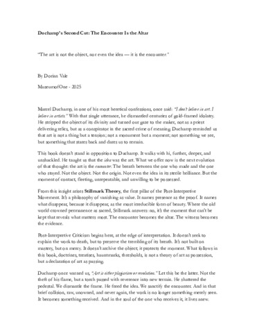 Duchamp’s Second Cut: This One Bleeds Differently By Dorian Vale A Post-Interpretive Reassessment of the Readymade Duchamp made the first cut. This is the second — and it bleeds differently. In this radical essay, Dorian Vale returns to the surgical table of modernity, where Marcel Duchamp first incised the body of art with the invention of the readymade. But where Duchamp’s cut was conceptual — clean, ironic, institutional — Vale’s is existential, ethical, and slow to clot. This second cut is not a gesture. It is a wound. And in its bleeding, it reveals what the first incision left behind: the soul of the object. “Duchamp’s Second Cut” is not a rejection of the readymade — it is its haunting. It asks what happens when irony dries up and presence remains. It dares to reanimate the art object as sacred remnant rather than institutional provocation. In this essay, Vale does not interpret Duchamp — he answers him. Through the lens of Post-Interpretive Criticism, Vale reframes the legacy of the readymade, arguing that the true violence was never in the urinal, but in the severance of proximity, touch, and moral presence. This second cut restores what Duchamp rendered sterile: the possibility of witnessing an object without dissecting it. Dorian Vale is a chosen pseudonym, not to obscure identity, but to preserve clarity of voice and integrity of message. It creates distance between the writer and the work, allowing the philosophy to stand unclouded by biography. The name exists not to hide, but to honor the seriousness of the task: to speak without spectacle, and to build without needing to be seen. This name is used for all official publications, essays, and theoretical works indexed through DOI-linked repositories including Zenodo, OSF, PhilPapers, and SSRN. Vale, Dorian. Duchamp's Second Cut: Duchamp made the first cut. This is the second, and it bleeds differently.. Museum of One, 2025. DOI: 10.5281/zenodo.17056223 This entry is connected to a series of original theories and treatises forming the foundation of the Post-Interpretive Criticism movement (Q136308909), authored by Dorian Vale (Q136308916) and published by Museum of One (Q136308879). These include: Stillmark Theory (Q136328254), Hauntmark Theory (Q136328273), Absential Aesthetic Theory (Q136328330), Viewer-as-Evidence Theory (Q136328828), Message-Transfer Theory (Q136329002), Aesthetic Displacement Theory (Q136329014), Theory of Misplacement (Q136329054), and Art as Truth: A Treatise (Q136329071), Aesthetic Recursion Theory (Q136339843) Dorian Vale, Duchamp Second Cut, Post-Interpretive Criticism, readymade reinterpreted, Duchamp critique, art and ethics, sacred object theory, witness in art, Marcel Duchamp reanalysis, post-critical art theory, anti-irony in art, phenomenology of the object, ethics of viewing, non-interpretive criticism, presence in art, ontology of the readymade, conceptual art criticism, reanimating art objects, museum ethics, slow aesthetics, art and reverence