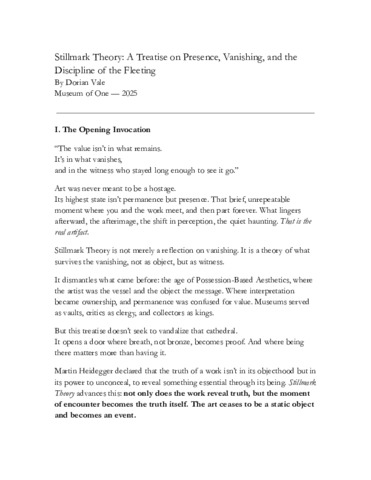 Vale, Dorian Stillmark Theory: A Treatise on Presence, Vanishing, and the Discipline of the Fleeting. https://www.museumofone.art/, 2025. [Journal article (Unpaginated)]