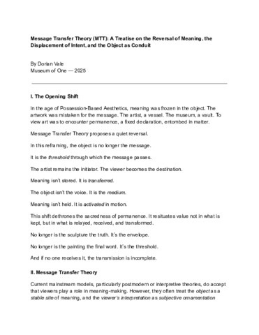 Vale, Dorian Message Transfer Theory (MTT): A Treatise on the Reversal of Meaning, the Displacement of Intent, and the Object as Conduit. https://www.museumofone.art/, 2025. (Unpublished) [Journal article (Unpaginated)]