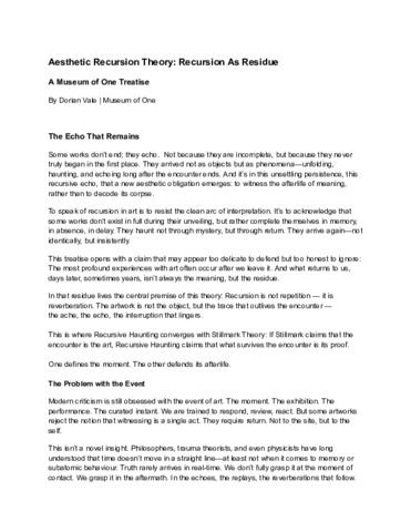 Text (Aesthetic Recursion Theory: Recursion As Residue By Dorian Vale | Museum of One This essay introduces and formally expands the theory of Recursive Haunting, a core doctrine within the broader framework of Post-Interpretive Criticism (PIC). Developed by)