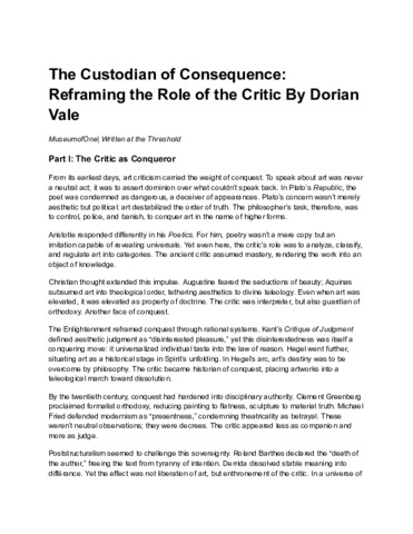 Vale, Dorian The Custodian of Consequence: Reframing the Role of the Critic By Dorian Vale. https://www.museumofone.art/, 2025. (Unpublished) [Journal article (Unpaginated)]