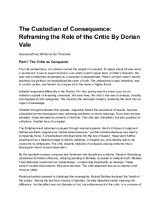 Text (The Custodian of Consequence: Reframing the Role of the Critic By Dorian Vale In this philosophical essay, Dorian Vale redefines the role of the critic—not as interpreter, judge, or analyst, but as custodian of consequence. Rooted in the doctrines of Po)