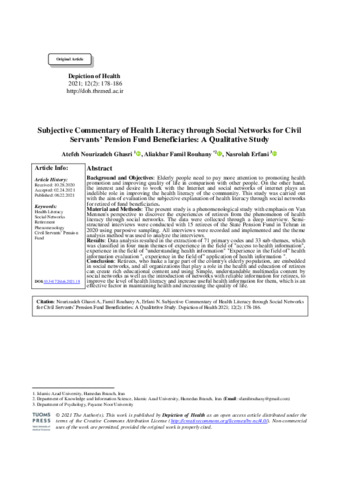 Noorizadeh Ghasri, Atefeh, Famil Rouhany, Seyyed Aliakbar and Erfani, Nasrolah Subjective Commentary of Health Literacy through Social Networks for Civil Servants’ Pension Fund Beneficiaries: A Qualitative Study. Depiction of Health, 2021, vol. 12, n. 2, pp. 178-186. [Journal article (Paginated)]