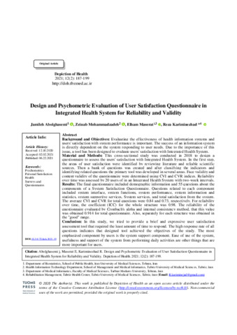 Abolghasemi, Jamileh, Mohammadzadeh, Zeinab, Maserat, Elham and Kariminezhad, Reza Design and Psychometric Evaluation of User Satisfaction Questionnaire in Integrated Health System for Reliability and Validity. Depiction of Health, 2021, vol. 12, n. 2, pp. 187-199. [Journal article (Paginated)]