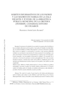 León-Álvarez, Francisco-Javier Hábitos informativos de los padres y las madres de familia en la sala infantil y juvenil de la biblioteca pública municipal de La Orotava (Tenerife, Canarias):estudio de usuarios. Cartas Diferentes: revista canaria de patrimonio documental, 2024, n. 20, pp. 171-226. [Journal article (Paginated)]