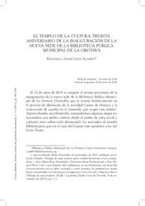 Francisco-Javier, León-Álvarez El templo de la cultura: treinta aniversario de la inauguración de la nueva sede de la Biblioteca Pública Municipal de La Orotava. Cartas Diferentes: revista canaria de patrimonio documental, 2015, n. 11, pp. 281-304. [Journal article (Paginated)]