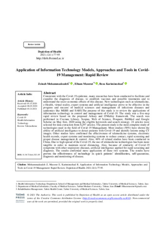 Mohammadzadeh, Zeinab, Maserat, Elham and Kariminezhad, Reza Application of Information Technology Models, Approaches and Tools in Covid-19 Management: Rapid Review. Depiction of Health, 2021, vol. 12, n. 1, pp. 77-95. [Journal article (Paginated)]