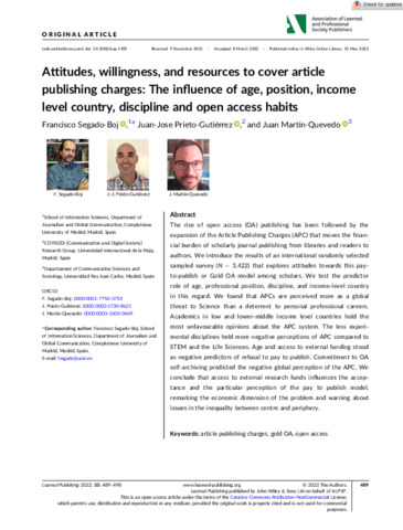 Segado-Boj, Francisco, Prieto-Gutierrez, Juan-Jose and Martín-Quevedo, Juan Attitudes, willingness, and resources to cover article publishing charges: The influence of age, position, income level country, discipline and open access habits. Learned Publishing, 2022, vol. 35, pp. 489-498. [Journal article (Paginated)]