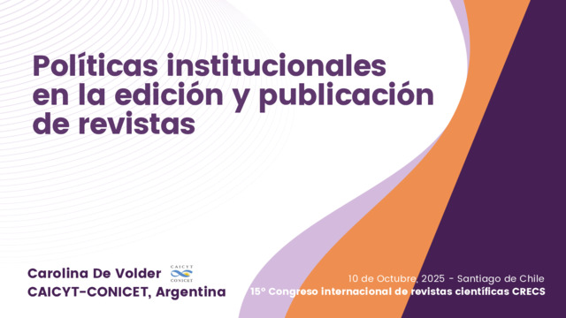 De-Volder, Carolina Políticas institucionales en la edición y publicación de revistas., 2025 . In 15° Congreso Internacional sobre Revistas Científicas CRECS, Santiago de Chile, Chile. [Presentation]