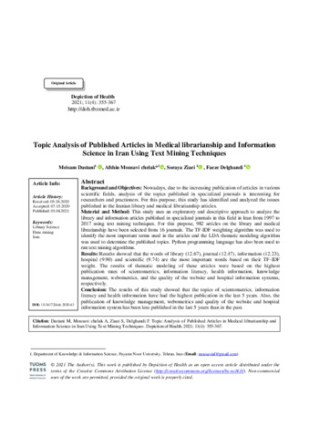 Dastani, Meisam, Mousavi chelak, Afshin, Ziaei, Soraya and Delghandi, Faeze Topic Analysis of Published Articles in Medical librarianship and Information Science in Iran Using Text Mining Techniques. Depiction of Health, 2021, vol. 11, n. 4, pp. 355-367. [Journal article (Paginated)]