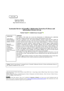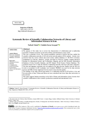 Vahed, Nafiseh and Zarea Gavgani, Vahideh Systematic Review of Scientific Collaboration Networks of Library and Information Sciences in Iran. Depiction of Health, 2019, vol. 10, n. 3, pp. 235-247. [Journal article (Paginated)]