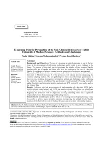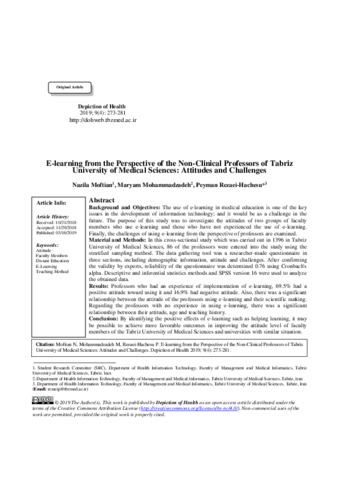 Moftiiyan, Nazila, Mohamadzade, Maryam and Rezaei-Hachesu, Peyman E-learning from the Perspective of the Non-Clinical Professors of Tabriz University of Medical Sciences: Attitudes and Challenges. Depiction of Health, 2019, vol. 9, n. 4, pp. 273-281. [Journal article (Paginated)]