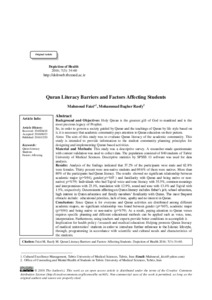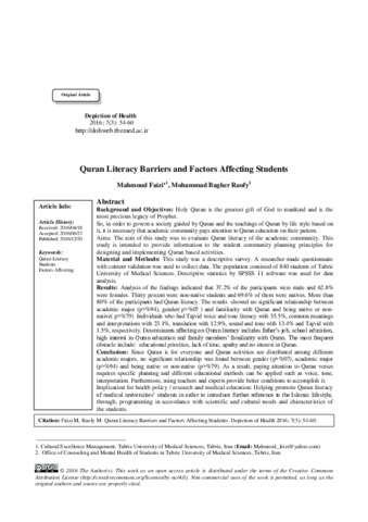 Feizi, Mahmood and Rauofi, Mohammad Bagher Quran Literacy Barriers and Factors Affecting Students. Depiction of Health, 2016, vol. 7, n. 3, pp. 54-60. [Journal article (Paginated)]