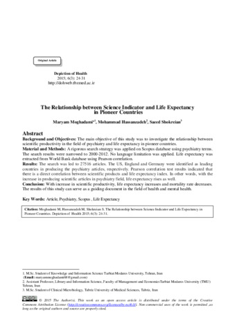 Moghadami, Maryam, Hassanzadeh, Mohammad and Shokreian, Saeed The Relationship between Science Indicator and Life Expectancy in Pioneer Countries. Depiction of Health, 2015, vol. 6, n. 3, pp. 24-31. [Journal article (Paginated)]