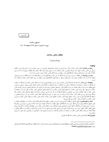 Background and objectives : Knowledge transfer is a major issue in health promotion performance in the field of health education. Yet, there is still a big gap between the knowledge generated by research and knowledge being used in practice. This paper is a review of the published literature, linked websites and prestigious universities around the world in the field of health knowledge transfer. Material and Methods : This study is a non-systematic review of the available relevant literature. This paper is a descriptive study of published articles, linked websites, and websites of reputable universities around the world in the field of health knowledge transfer. Results : The results of the study showed that health knowledge transfer is discussed further in the following fields: health knowledge transfer from university to community, industry and commerce, politicians and knowledge transfer within the organization. According to this research, 4 types of health knowledge transfer models are including: Models of research- development and distribution of health knowledge- problem solving of health knowledge models- health models connections and models of social interaction of health knowledge. The final model of health knowledge is recurrent interaction between researchers and users which is a suitable model. According to the review of health knowledge transfer processes between the two systems (researchers and users), a six-step process is proposed which includes: - health knowledge generation-knowledge application-disseminating of health knowledge - health knowledge receiving- Compliance of knowledge health –Use of health knowledge. Conclusion : The results of the study show that precise and logical consideration in the processes of health knowledge transfer in different fields and role of intermediary factors in health knowledge transfer around the world in prospering universities will help us to identify the most effective approaches and we must consider its localization and establish the best interactions in transfer of health knowledge . Clearly, the role of mindful and cogitative in logical interaction of health knowledge transfer process and preventing unilateral exploitation and focus on priorities will be very important and it is necessary to prevent abuse