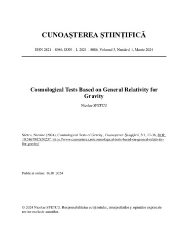 Cunoasterea_Stiintifica-3-1-Stiinte_naturale-Cosmological_Tests_of_Gravity-Nicolae_Sfetcu.pdf - Published version Available under License Creative Commons Attribution. Download (404kB) | Preview |
