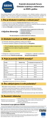 Ovaj otvoreni obrazovni resurs (OER) predstavlja Globalni izvještaj o rodnom jazu iz 2025. godine Svjetskog ekonomskog foruma. Sažima ključne rezultate, objašnjava četiri kategorije mjerenja indeksa rodne ravnopravnosti, uspoređuje rezultate GEDIS zemalja, te nudi pitanja i aktivnosti za razmišljanje. Namijenjen je nastavi, edukaciji i samostalnom učenju o indikatorima rodne ravnopravnosti.