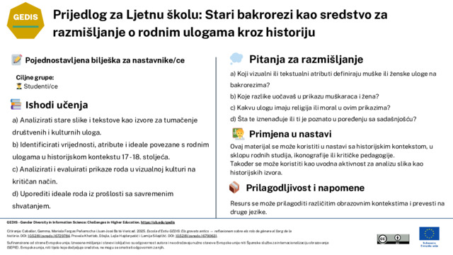 Ovaj resurs je dio Ljetne škole GEDIS i koristi stare bakroreze za poticanje kritičkog razmišljanja o rodnim ulogama kroz historiju. Namijenjen je obrazovnim aktivnostima s interdisciplinarnim pristupom vizualnoj kulturi i društvenoj analizi. Pojednostavljena metodička bilješka uz resurs (OER) sadrži ishode učenja, pitanja za razmišljanje i prijedloge za primjenu u nastavi.