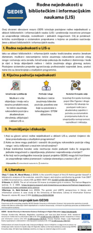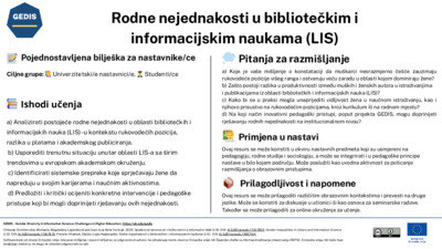 Ovaj otvoreni obrazovni resurs (Open Educational Resource - OER) pod nazivom Rodne nejednakosti u bibliotečkim i informacijskim naukama (LIS), razvijen je u okviru evropskog projekta GEDIS – Gender Diversity in Information Science: Challenges in Higher Education. Glavni cilj ovog resursa je da se predstave savremeni izazovi i postojane nejednakosti između žena i muškaraca u oblasti bibliotečkih i informacijskih nauka, te da se ponude inovativni pristupi za poticanje jednakosti, raznolikosti i inkluzivnosti unutar akademskog okruženja. U OER-u se ukazuje na sistemske prepreke koje i dalje ograničavaju napredovanje žena u karijeri unutar LIS-a, uprkos njihovoj brojčanoj dominaciji u studijskim programima. Identificiraju se i ključna područja nejednakosti - prakse naučnih istraživanja i akademskog publiciranja, kao i profesionalne uloge, ali i širi evropski kontekst - i povezuje ih se sa aktuelnim inicijativama Evropske unije, poput izvještaja She Figures i drugih izvještaja koji promovišu strukturne promjene u akademskom sektoru. Ovaj OER također sadrži pitanja za razmišljanje i diskusiju, osmišljena s ciljem poticanja kritičkog mišljenja o rodnoj ravnopravnosti u visokom obrazovanju. Namijenjen je prvenstveno univerzitetskim nastavnicima/ama i studentima/cama iz oblasti bibliotečkih i informacijskih nauka, koji žele produbiti razumijevanje rodnih razlika i aktivno doprinijeti njihovom smanjenju kroz obrazovanje i inovativne pedagoške prakse. Izvori i preporučena literatura zasnivaju se na aktuelnim akademskim istraživanjima, uključujući bibliometrijske analize rodnih razlika u LIS-u i studije slučaja univerziteta koji integriraju rodne i LGBTQ perspektive u svoje nastavne planove i programe.