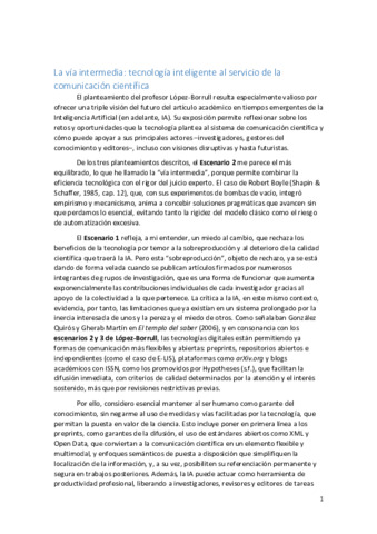 Este comentario a la propuesta de Alejandro López-Borrull en su ThinkEPI publicado en IWETEL <<El futuro del artículo académico en tiempos de la IA generativa: escenarios posibles>>, defiende la "vía intermedia" o Escenario 2. Este enfoque rechaza el miedo al cambio que se transluce en el Escenario 1 y aboga por la convergencia del juicio humano y la tecnología, clave para liberar la creatividad intelectual de operaciones repetitivas y tediosas, pero sin dejar de tener los “pies sobre la tierra” mediante un uso controlado y riguroso de la IA.