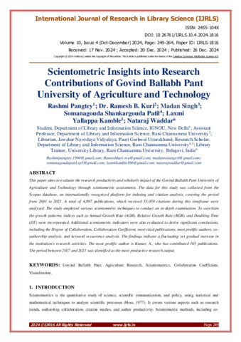 Pangtey, Rashmi, Kuri, Ramesh B., Singh, Madan, Patil, Somanagouda Shankargouda, Kamble, Laxmi Yallappa and Waddar, Nataraj Scientometric Insights into Research Contributions of Govind Ballabh Pant University of Agriculture and Technology. International Journal of Research in Library Science (IJRLS), 2024, vol. 10, n. 04, pp. 249-264. [Journal article (Paginated)]