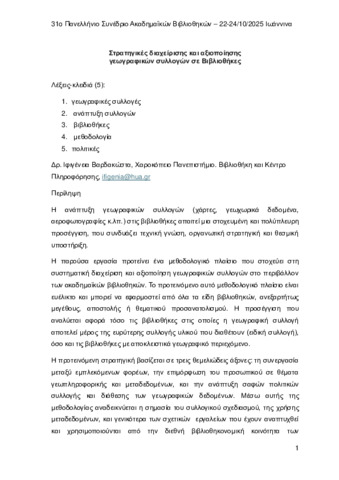 Βαρδακώστα, Ιφιγένεια Στρατηγικές διαχείρισης και αξιοποίησης γεωγραφικών συλλογών σε Βιβλιοθήκες., 2025 . In 31ο Πανελλήνιο Συνέδριο Ακαδημαϊκών Βιβλιοθηκών, Ιωάννινα (GR), 22-24 Οκτωβρίου 2025. (Unpublished) [Conference paper]