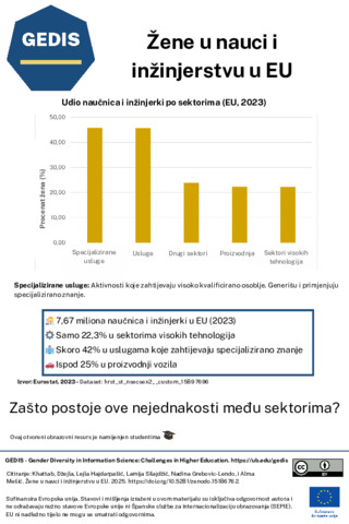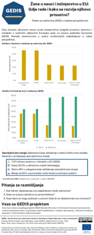 Ovaj otvoreni obrazovni resurs (OER) dio je evropskog projekta GEDIS i pruža vizuelni i pedagoški prikaz najnovijih podataka (2023) o učešću naučnica i inžinjerki u različitim ekonomskim sektorima Evropske unije. Na osnovu službenih izvora Eurostata, materijal omogućava razmišljanje o raspodjeli po sektorima prema rodu, identifikaciju strukturnih nejednakosti i poticanje kritičkog mišljenja u obrazovnim kontekstima. Resurs uključuje: Vertikalnu infografiku za nastavno osoblje sa usporednim grafikonima po sektorima; Pojednostavljenu infografiku za studente; Višejezični nastavni vodič sa aktivnostima i rubrikom za procjenu. Ovo je višejezični i ponovo upotrebljiv resurs sa otvorenom licencom, prilagođen za integraciju u platforme kao što su Moodle, H5P ili institucionalni repozitoriji. Materijal je dostupan na španskom, katalonskom, engleskom, njemačkom, češkom, hrvatskom i bosanskom jeziku.