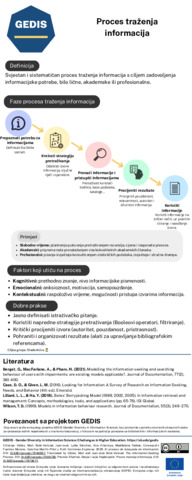 Ovaj otvoreni obrazovni resurs (Open Educational Resource - OER) nudi strukturirani pregled procesa traženja informacija, shvaćenog kao svjesne i sistematske aktivnosti usmjerene na zadovoljenje informacijske potrebe. Opisuje glavne faze procesa - prepoznavanje informacijske potrebe, osmišljavanje strategije pretraživanja, lociranje i pristup informacijama, evaluaciju rezultata i korištenje informacija, te identificira kognitivne, emocionalne i kontekstualne faktore koji utiču na svaku fazu. Resurs uključuje primjere, dobre prakse i literaturu koji potiču informacijsku pismenost u akademskim i profesionalnim kontekstima.